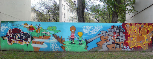 В один из вечеров, отправившись в клуб "Дом у дороги", который, как известно, находится возле метро "Спортивная", решили погулять окрест, благо место там очень спокойное, душевное и маломашинистое. Неторопливо проходя по одной из улочек, увидели живописное полотно (другого слова не подберу) и застряли возле него минут на пятнадцать. Не сфотографировать это было нельзя. Вот он, этот, без преувеличения, шедевр: